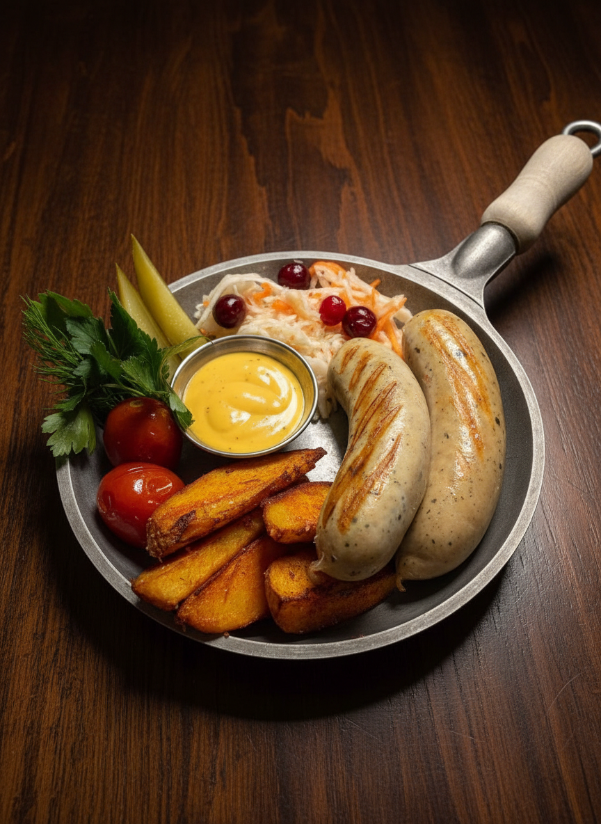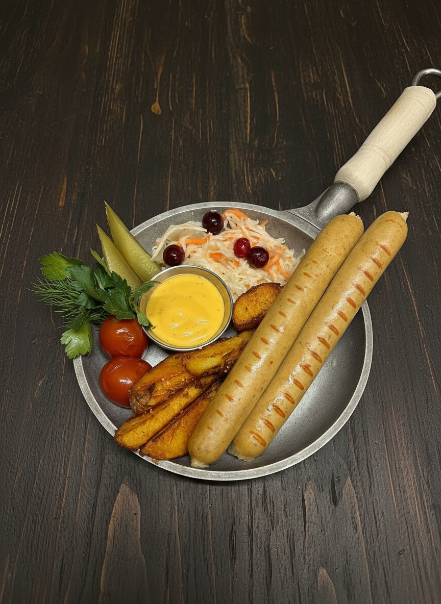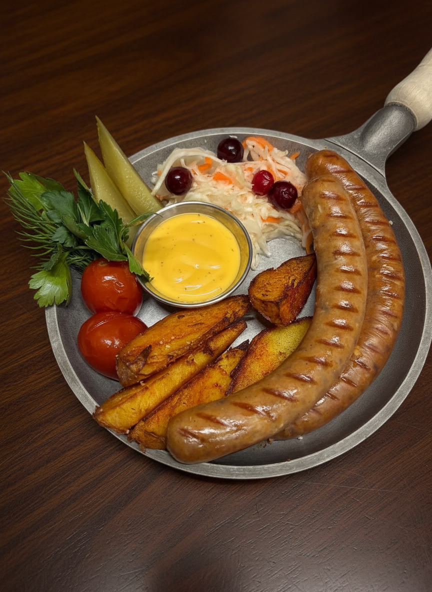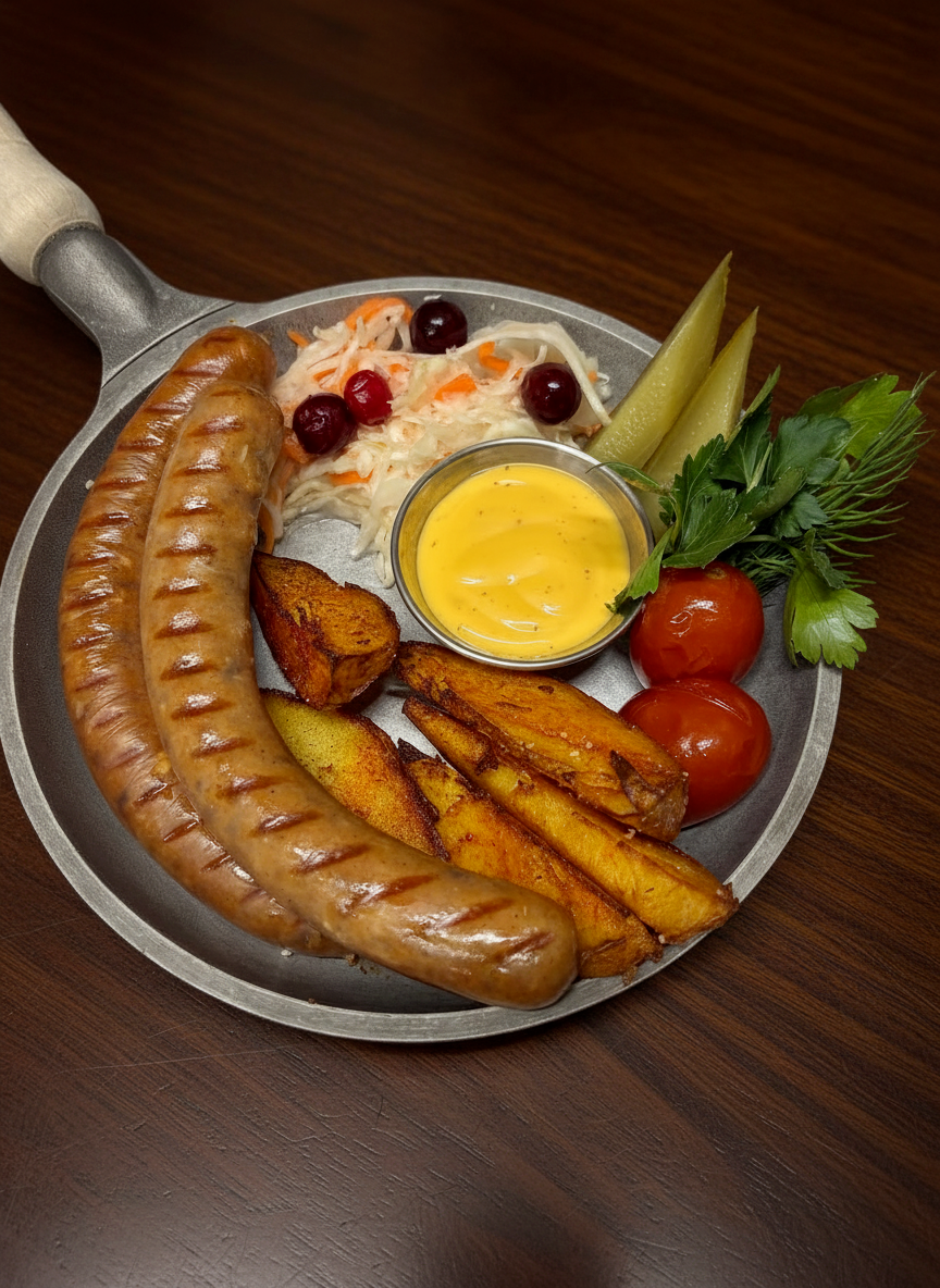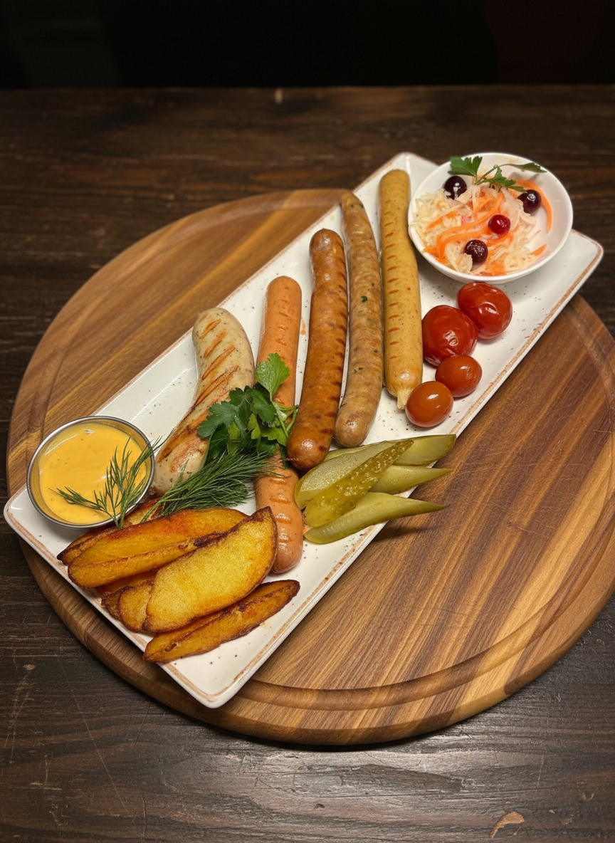 Пять видов колбасок , соленья, картофель по-деревенски, немецкий брецель