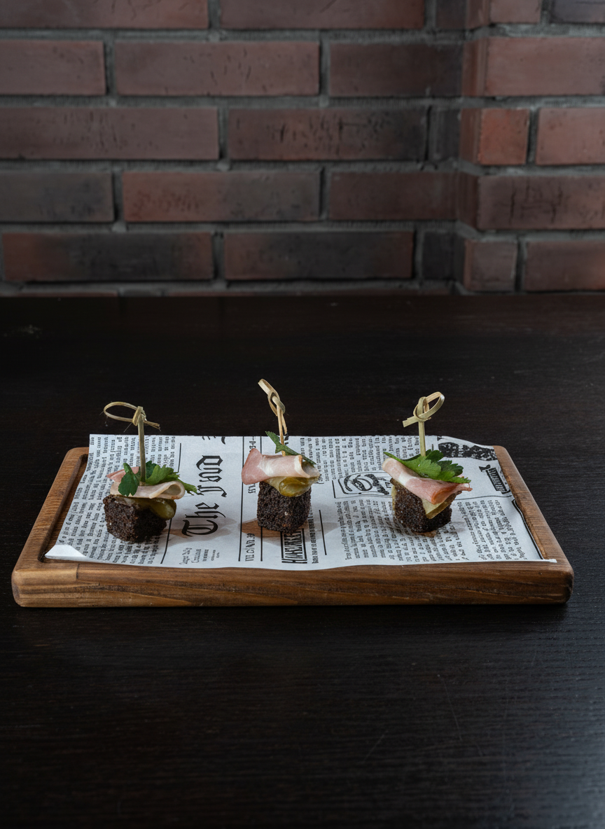 Канапе на бородинском хлебе с солёным огурцом и беконом