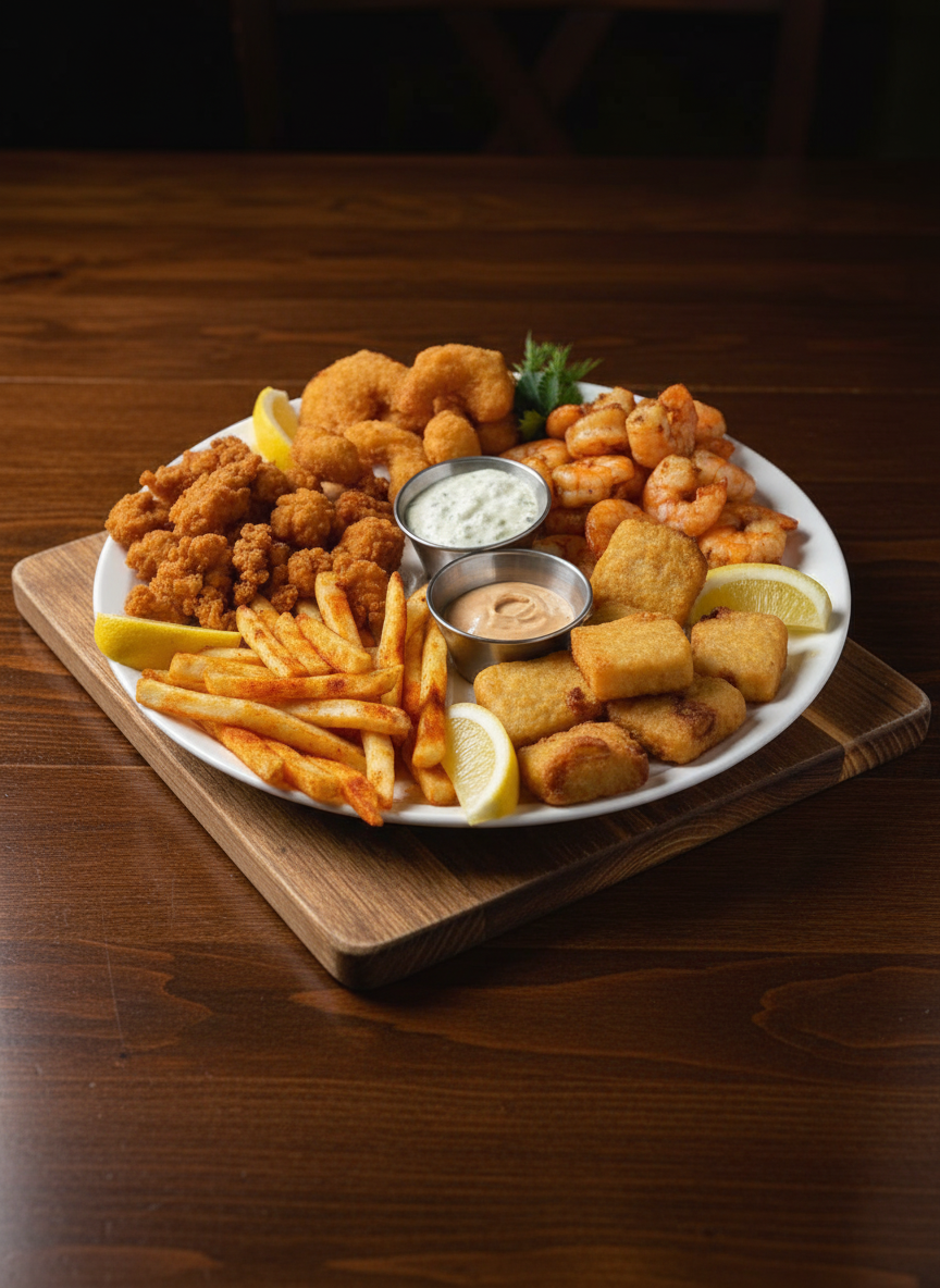 Жареные королевские креветки, филе кальмара, фишачипс с картофелем фри, королевские креветки в панировке